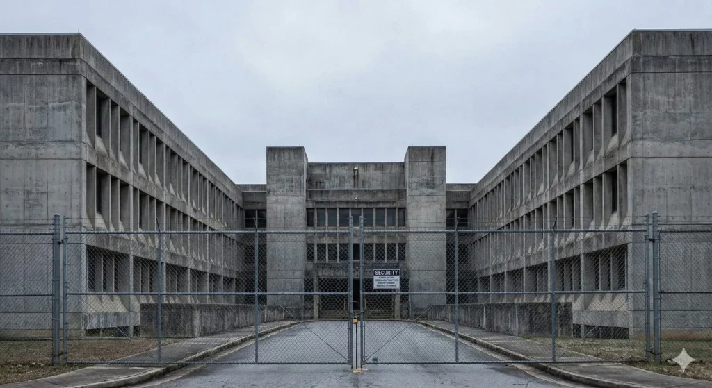 - The brutalist exterior of the former Georgia Mental Health Institute